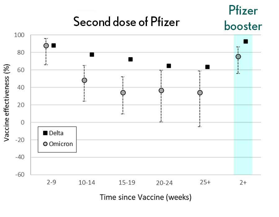 Graph showing Pfizer booster is about 80% effective after 2 weeks against Omicron