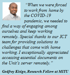 With a virtual private network (VPN) connection – a secure tunnelling technology, staff have been able to securely access the Unit’s local resources from the unsecure public internet by connecting from outside MITU. Remote support tools have also enabled the IT technicians gain access to the remote laptops used by staff working from home and provide technical support in cases of need.