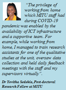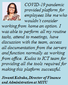 MITU is connected through fibre internet – a broadband connection that uses fibre-optic technology to provide fastest speeds data over greater distances without major lag time. With such infrastructure in place, staff are connecting to box drive (a cloud storage service) with ease enabling them to share documents remotely from anywhere anytime. With laptop computers, USB speakerphones, headphones and the internet, staff have been able to stay connected and maintain workflow continuity and conduct live meetings and presentations using Zoom – a video conferencing web platform.